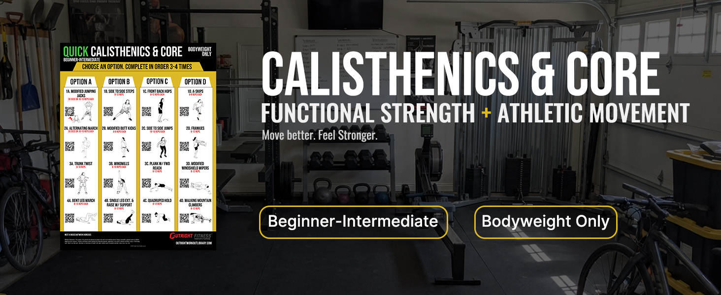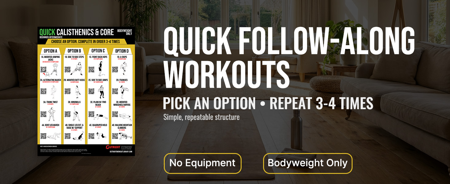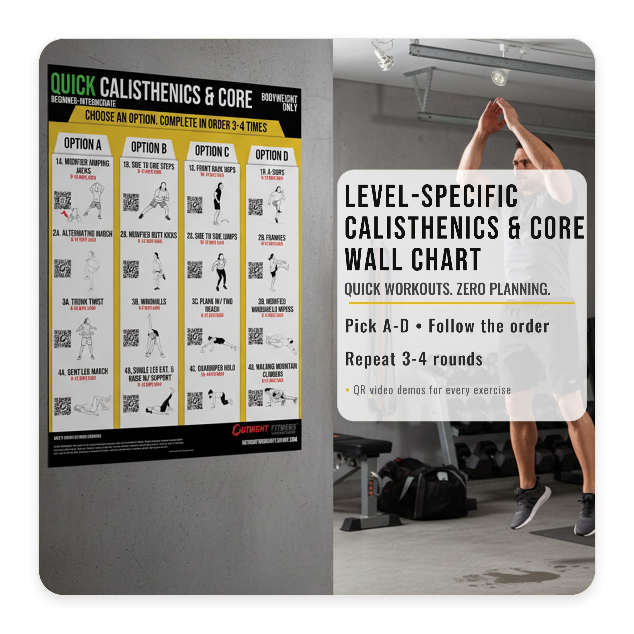 The Outright Fitness Quick Calisthenics & Core wall chart is a structured, follow-along bodyweight workout chart you can use anywhere for fast, repeatable sessions.