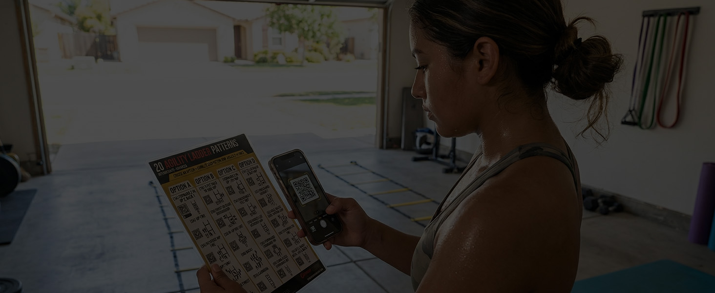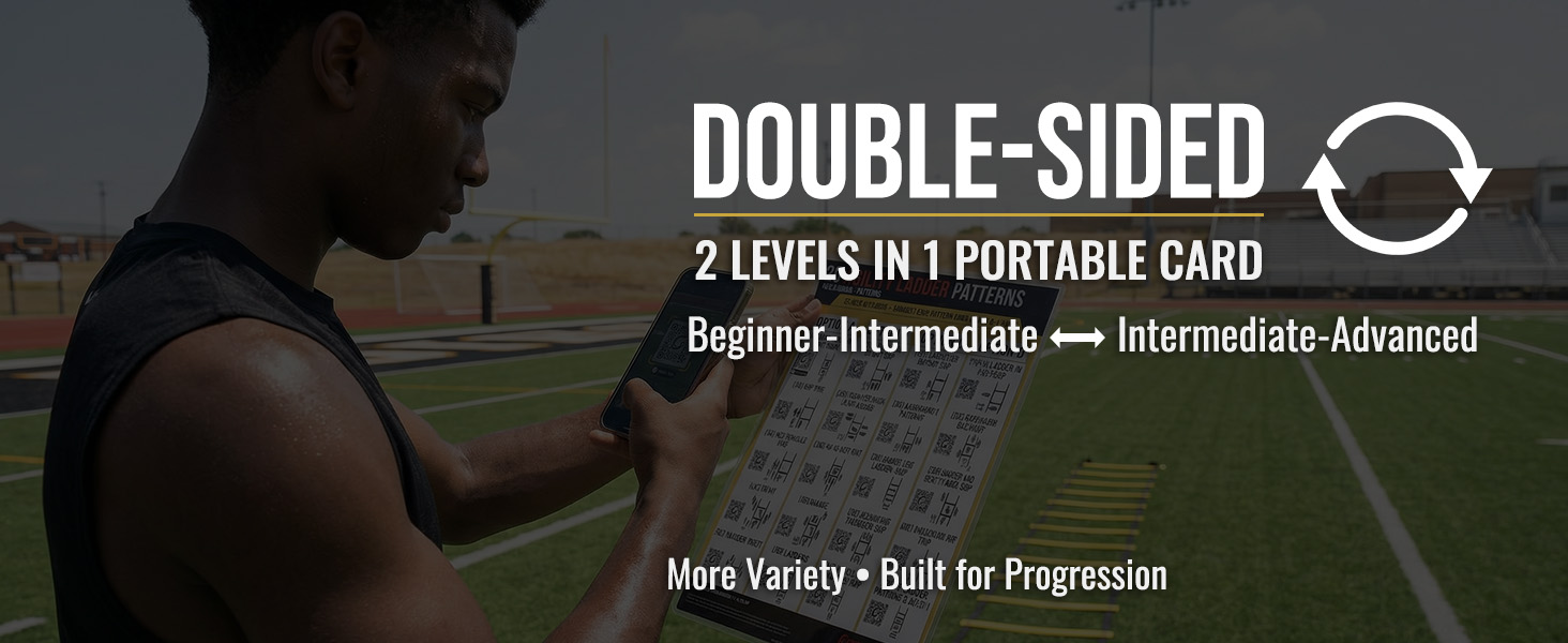 The Outright Fitness 8.5×11 Laminated 20 Agility Ladder Patterns Portable Training Card is a compact, durable format you can use anywhere, home gyms, training facilities, schools, or anywhere you have an agility ladder. Pick Option A, B, C, or D, then complete each pattern down & back 2–4 times for a simple, repeatable ladder workout.