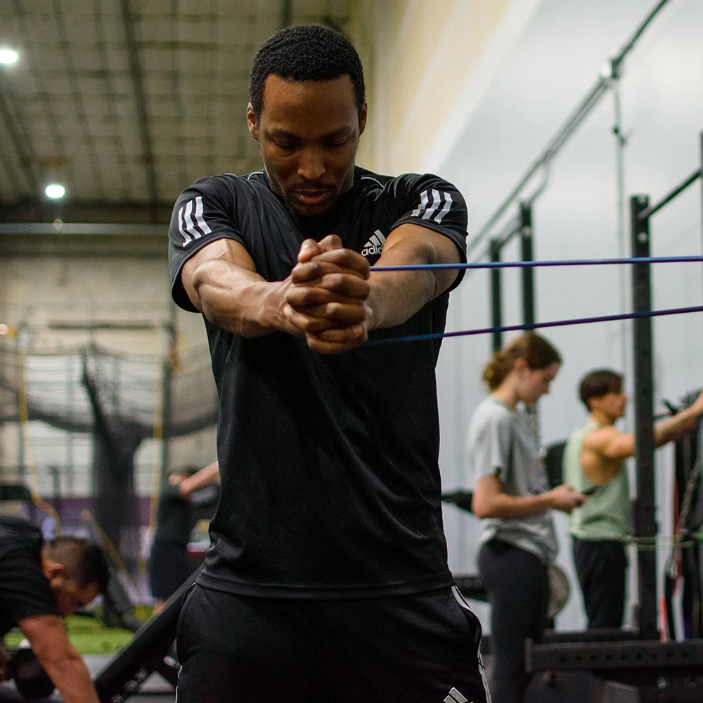 This workout can be done at home with a resistance band anchor and dumbbells, or in the gym if you prefer. Progress gradually by starting with lighter resistance and increasing weight over time as you build strength and confidence.